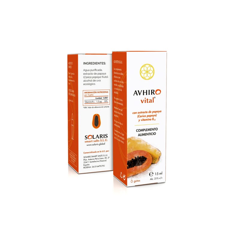 AvhiroVital Solaris contiene extracto natural de papaya y vitamina B12. Es ideal para reforzar y fortalecer el sistema inmunológico. Súper adecuado para combatir los agentes externos (virus, bacterias…).