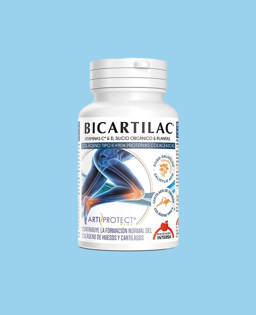 BICARTILAC® contiene cartílago de tiburón (40% de proteínas colagénicas, 23% glicosaminoglicanos, 17% condroitín sulfato, 10% glucosamina sulfato) que contribuyen a mantener las articulaciones flexibles.