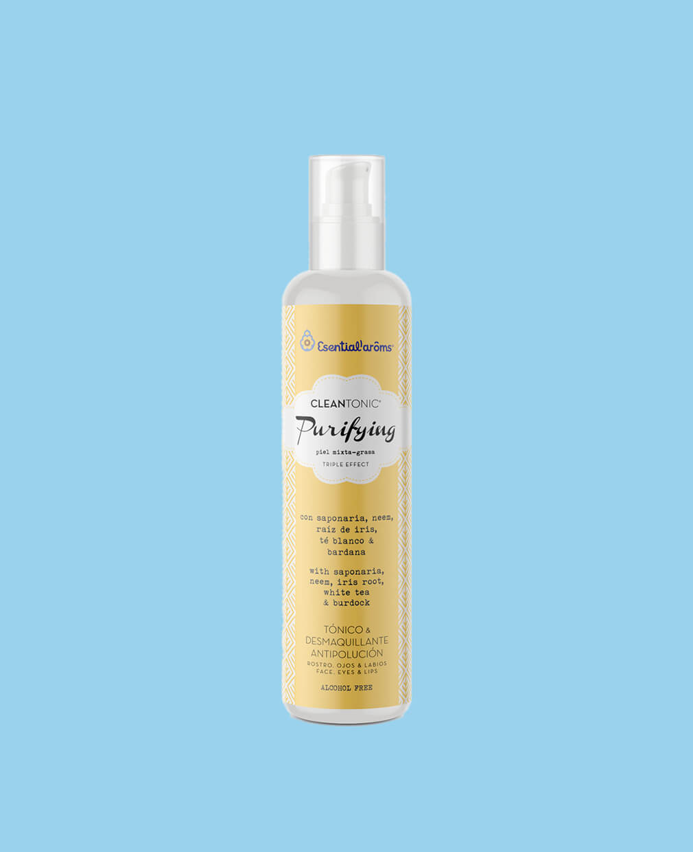 Aguas florales de flor de azahar (neroli), lavanda y flor de aciano; extractos de neem, raíz de iris, té blanco, bardana y cáscaras de cítricos (ácido múcico).