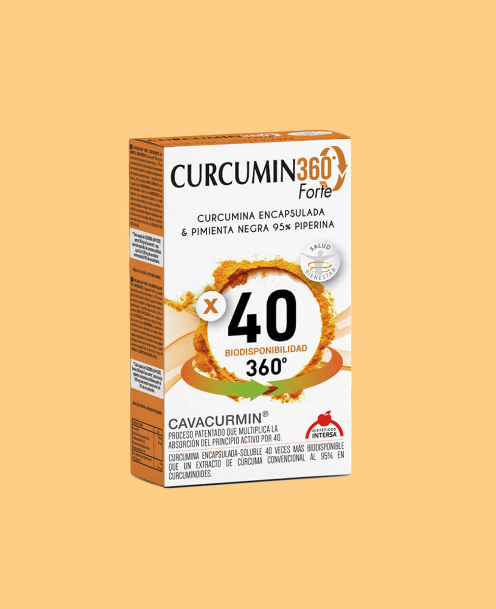 CURCUMIN-360º FORTE® es una innovadora sinergia (extracto de raíz de cúrcuma, y extracto de pimienta negra) para potenciar el bienestar, proteger y reparar el organismo. Contiene una forma de CÚRCUMA ENCAPSULADA que hace que los curcuminoides sean mucho más biodisponibles para el organismo. La curcumina encapsulada con oligosacáridos vegetales se libera en el epitelio intestinal de una forma muy eficaz, garantizando una absorción que se multiplica por 40; es decir, una dosis pequeña proporciona enormes beneficios (Máxima biodisponibilidad: 40 veces más biodisponible que un extracto de cúrcuma convencional al 95% en curcuminoides).