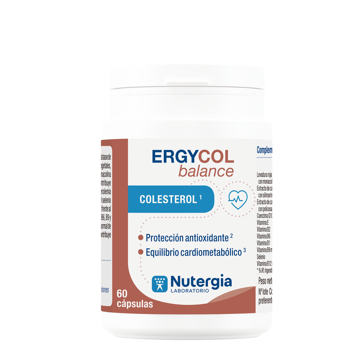 ERGYCOL Balance contiene Monacolina K (levadura roja de arroz) que reduce los niveles de colesterol y triglicéridos, Policosanol (caña de azúcar) que además es cardioprotector, Silimarina (Silybum marianum) que modula y protege al metaboilsmo hepatobiliar, Coenzima Q10 un antioxidante celular y cardioprotector, Vitamina E, B,B2,B, B9, B12 y Selenio, potentes antioxidantes y cofactores moduladores del metabolismo de la homocisteina.