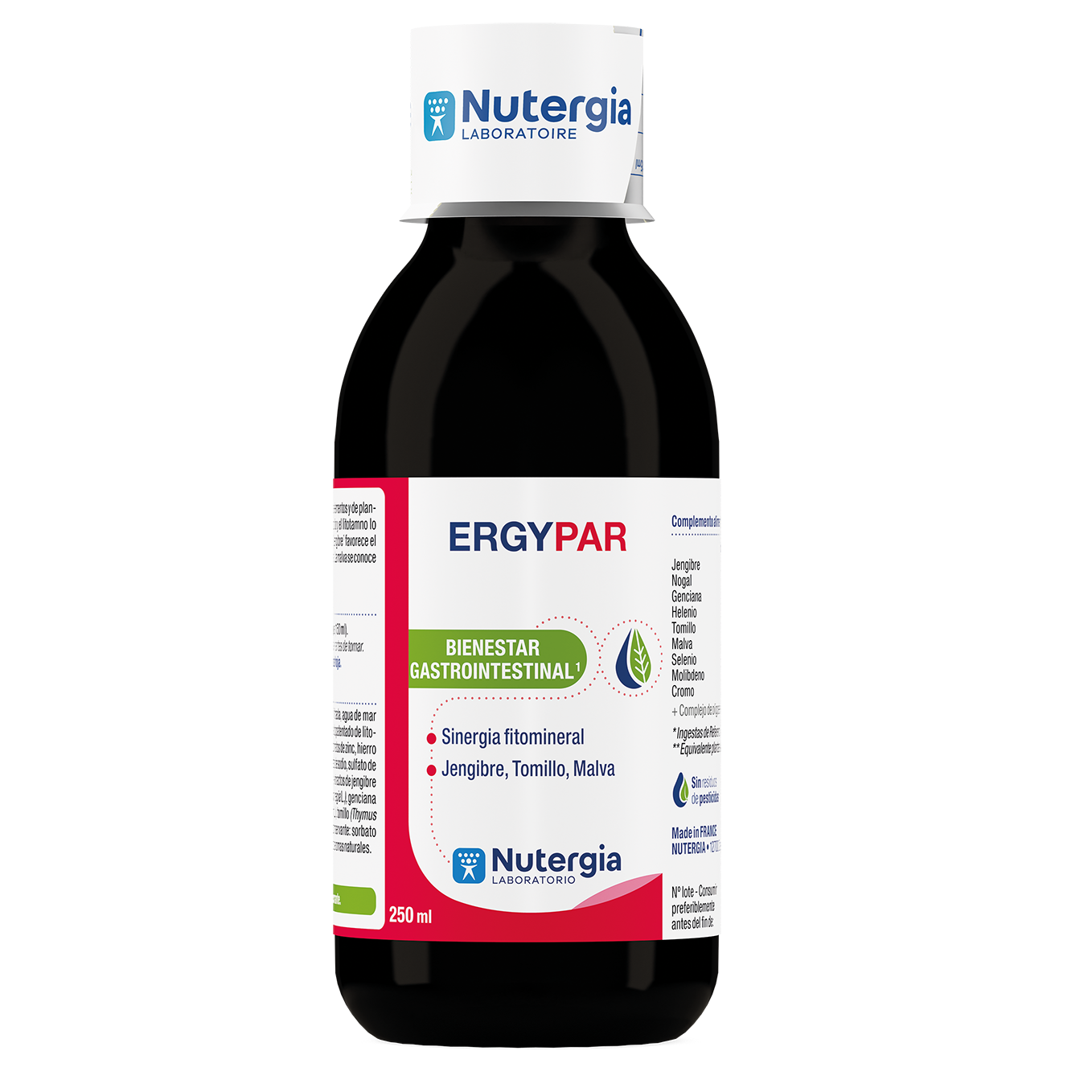 Solución acuosa de oligoelementos (agua filtrada, agua de mar concentrada sin sodio, extracto estandarizado de litotamo – Phymatolithon calcareum Pall., gluconatos de zinc, hierro y cobre, cloruro de cromo, selenita y molibdato de sodio, sulfato de manganeso), estabilizante: glicerol vegetal; extractos de jengibre** (Zingiber officinale Roscoe), nogal** (Juglans regia L.), genciana** (Gentiana lutea L.), helenio** (Inula helenium L.), tomillo** (Thymus vulgaris L.) y malva** (Malva sylvestris L.), conservante: sorbato de potasio; aroma natural de limón con otros aromas naturales.