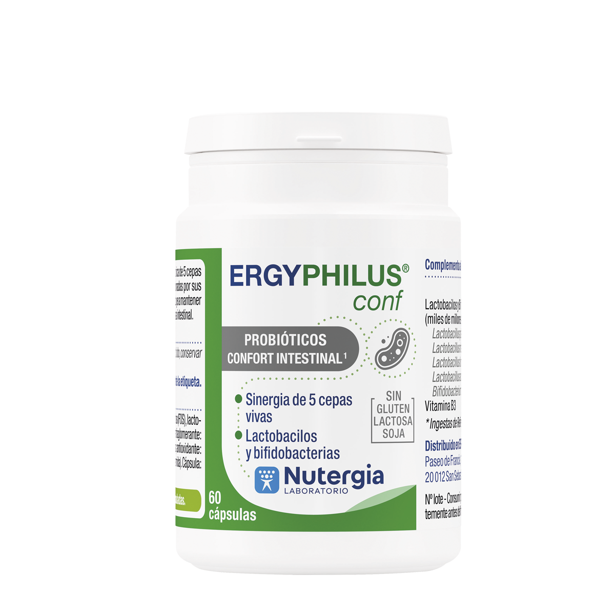 ERGYPHILUS® Conf. es una asociación científicamente equilibrada que combina cuidadosamente varias cepas probióticas respaldadas por la ciencia para ayudarte a mantener una flora intestinal equilibrada.