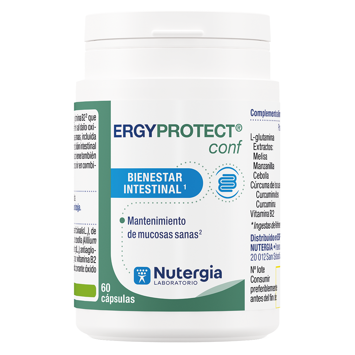 ​​ERGYPROTECT Conf combina glutamina, un nutriente único y esencial para las células de tu intestino, con plantas calmantes como la melisa y la manzanilla, además de potentes antioxidantes como la curcumina y la quercetina.