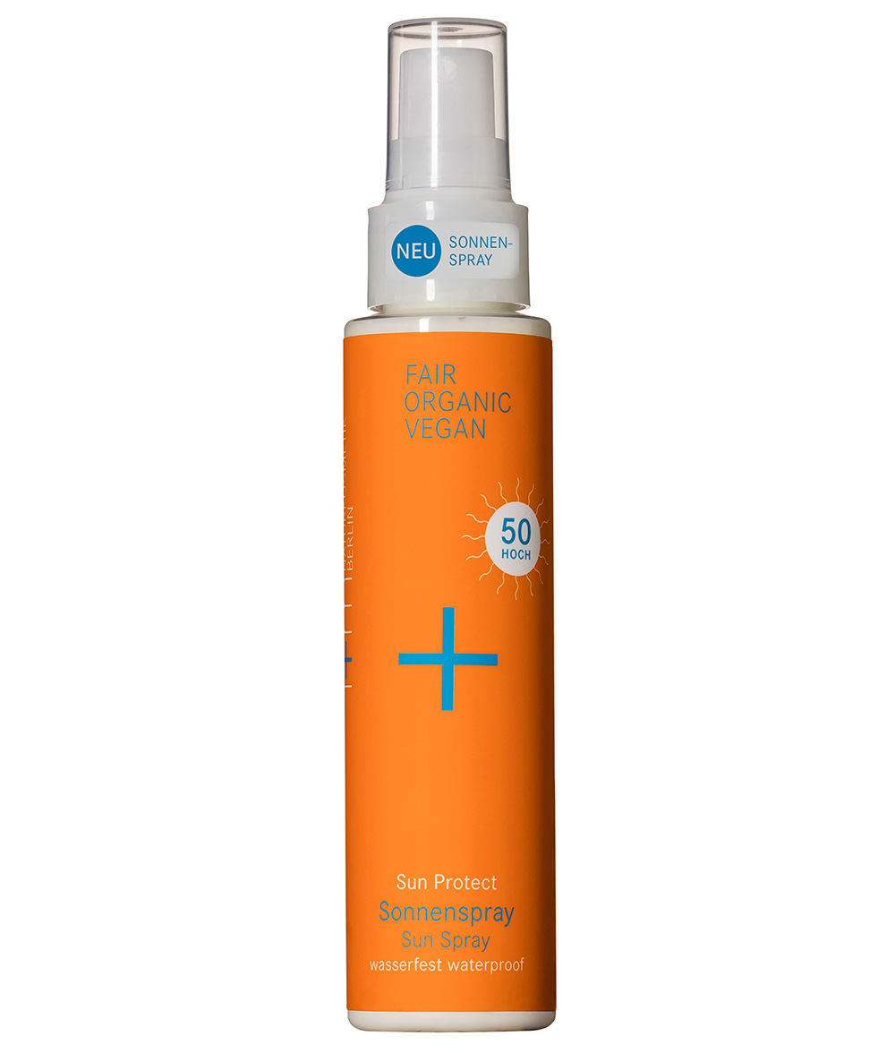 El spray solar nutre la piel y la protege con una protección solar mineral de amplio espectro con SPF50.